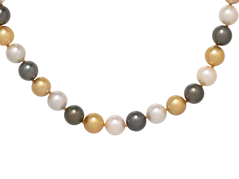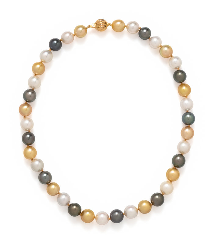 Consisting of various colored pearls measuring approximately 10.00-11.00 mm in diameter, strung knotted with yellow gold clasp. 17 inches long.