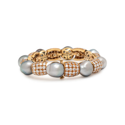 Containing eight Tahitian pearls measuring approximately 12.00-15.00 mm and numerous round brilliant cut diamonds weighing approximately 10.00 carats total. Mounted in yellow gold. 6 1/2 inches long.
