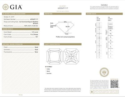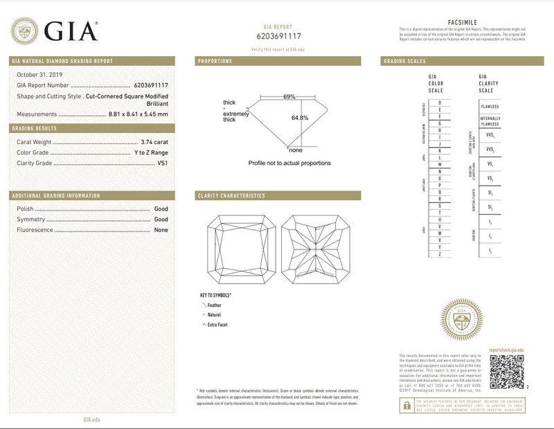GIA, 2019, Report No. 6203691117, 3.74 carats, Y to Z Range color, VS1 clarity, No fluorescence