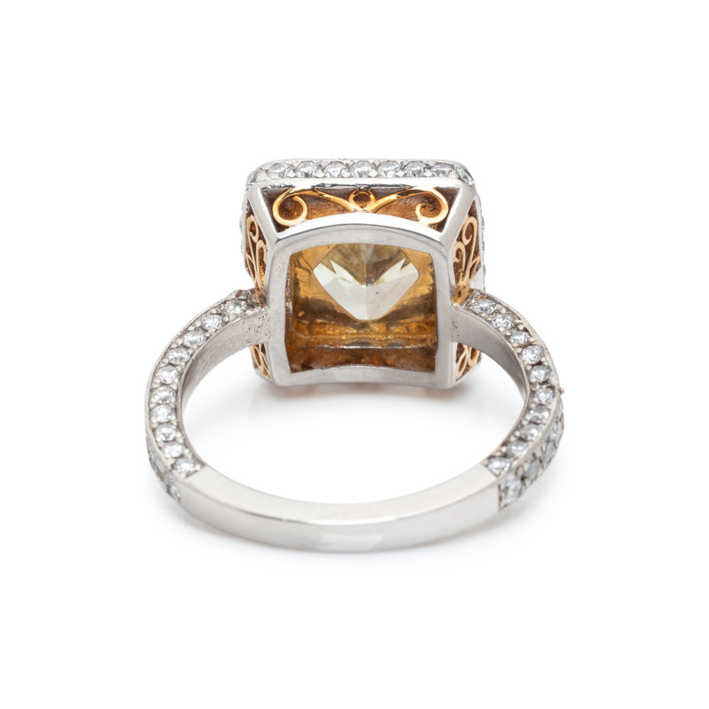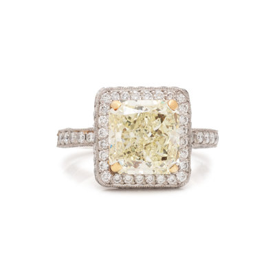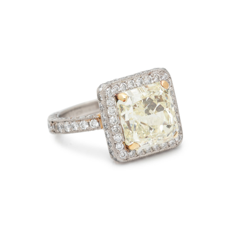 Containing one cut-cornered square modified brilliant cut diamond weighing 3.74 carats and 120 round brilliant cut diamonds weighing approximately 1.70 carat total. Mounted in platinum and yellow gold. Ring size 5.