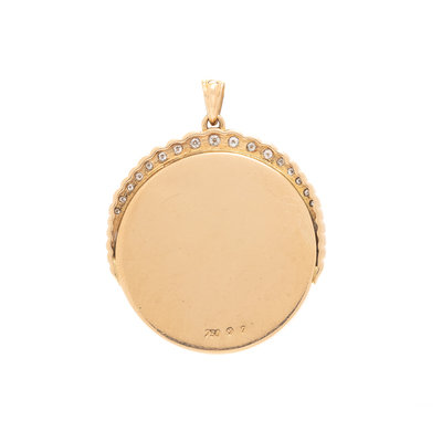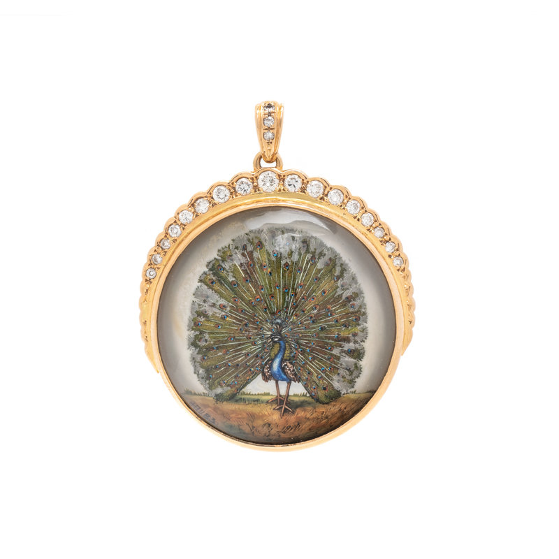 Consisting of a round Essex crystal depicting a peacock and 20 round brilliant and single cut diamonds weighing approximately 0.60 carat total. 1 3/8 inches long.