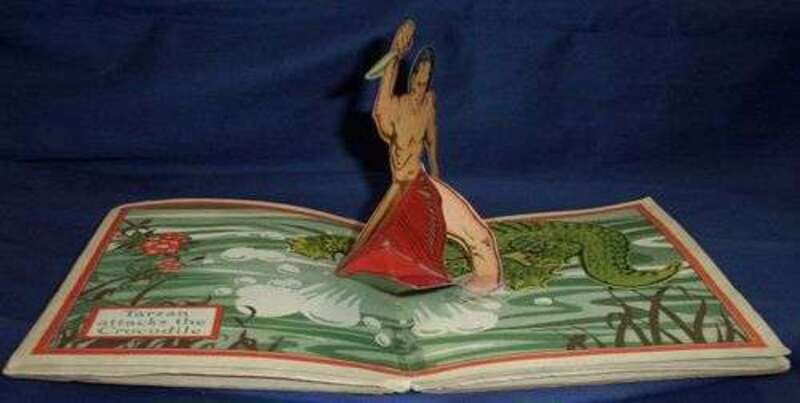 Burroughs, Edgar Rice. The New Adventures of Tarzan "Pop-Up." Chicago: Pleasure Books, (1935). Sm. 4to, orig. color pictorial bds.; edge wear, corners bumped, some chipping to spine, cello tape repairs to hinges. 3 color pop-up illustrations (intact & functional), other illus.