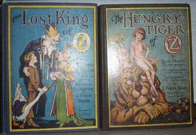 (Oz Books.) Thompson, Ruth Plumly: The Lost King of Oz. Chicago: Reilly & Lee, (1925). 1st ed., 1st state. 4to, orig. blue cloth, color pictorial cover label; edge wear, other light to moderate wear. Illustrated by John R. Neill, 12 color plates. Scattered foxing. Greene & Hanff 19. * The Hungry Tiger of Oz. Chicago: Reilly & Lee, (1926). 1st ed., 1st state. 4to, orig. dark green cloth, color pictorial cover label; moderate wear, some dust soiling, slightly cocked. Illustrated by John R. Neill, 12 color plates. Front free endpaper embellished with crayon in a child's hand. Some internal soiling. Greene & Hanff 20. Both with the plates coated on one side only.