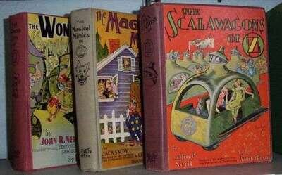 (Oz Books): Neill, John R. The Wonder City of Oz. Chicago: Reilly & Lee, (1940). 1st ed., 1st state. 4to, orig. red cloth, color pictorial cover label; light wear. Illus. by John R. Neill. Ownership leaf dampwrinkled, other-wise crisp & clean. Greene & Hanff 34. * _ _. The Scalawagons of Oz. Chicago: Reilly & Lee, (1941). 1st ed., 1st state. 4to, orig. brick red cloth, color pictorial light to moderate wear, hinges tender. Illus. by John R. Neill. Greene & Hanff 35. * Snow, Jack. The Magical Mimics in Oz. Chicago: Reilly & Lee, (1946). 1st ed., 1st state. 4to, orig. grey cloth, color pictorial cover label; edge wear, other light wear. Illus. by Frank Kramer. Greene & Hanff 37. Generally sound, bright copies with occasional abrasions to pictorial labels & some stress to hinges.