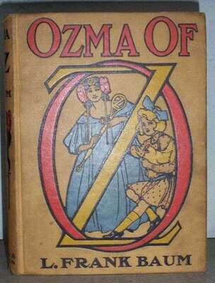(Oz Book.) Baum, L. Frank. Ozma of Oz. Chicago: Reilly & Britton, (1907) [but ca. 1910]. First edition, 2nd state. 4to, orig. black, red, blue and yellow pictorial stamped light tan cloth; light edge wear, head of spine slightly frayed, some dust soiling. Color & plain illus. by John R Neill. Blank endpapers. Sound copy.
