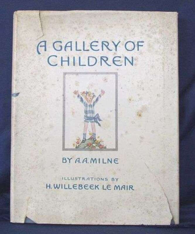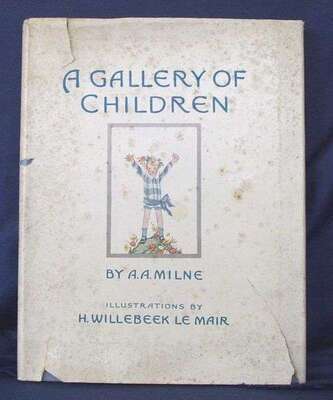 Milne, A.A. A Gallery of Children. Philadelphia: McKay, (1925). Illus. by Saida (H. Willebeek Le Mair). Folio, orig. gilt-lettered cloth, color pictorial cover label; light to moderate wear, d/j (chipped & foxed, some dust soiling). Color pictorial title page + 12 color plates. Some foxing to title & front matter.