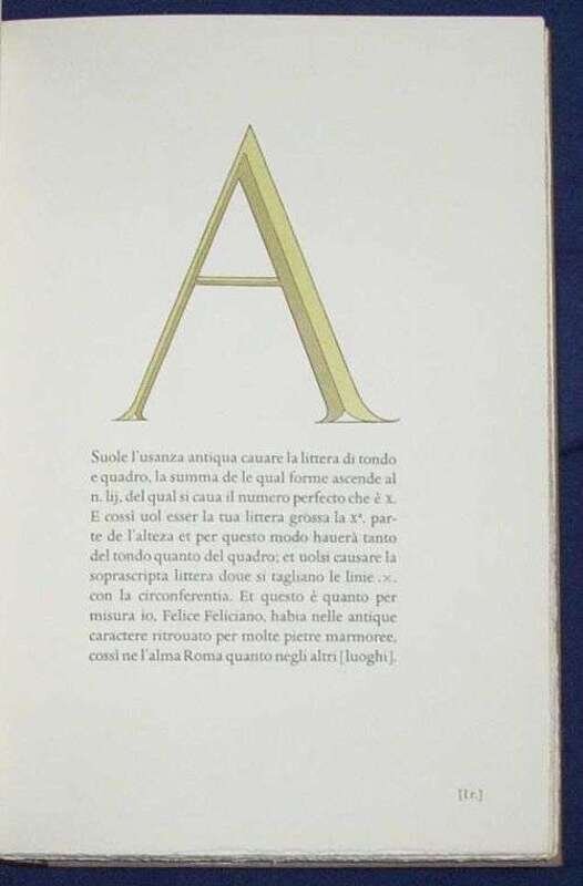 (Bodoni Press.) Feliciano, Felice. Alphabetum Romanum. Verona: Officinae Bodoni, (1960). #133/400. English language edition. 8vo, orig. morocco-backed grey bds., gilt, t.e.g., slipcase. 25 hand-colored letters. Introduction sheet inserted. Bright copy, very occasional, very minor wear.