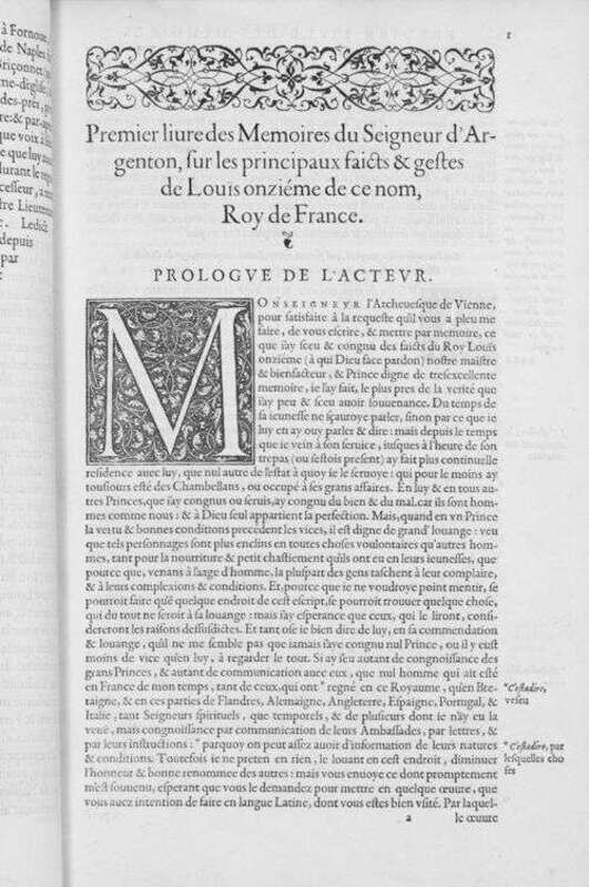 Comines, Philippe de, Seigneur d'Argenton. Les Memoires... Lyon: Jean de Tournes, 1559. Folio, 18th-century paneled calf, gilt; morocco spine labels; occasionally rubbed & blistered, joints tender. Trimmed - no loss of printing. Occasional old ink annotations to margins. Decorated initials. Generally internally clean & crisp. Armorial bookplate of John Ord.