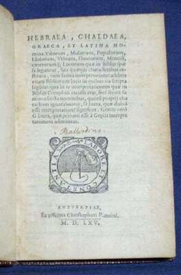 (Plantin, Christopher, printer.) Hebraea, Chaldaea, Greaeca, et Latina Nomina Virorum... Antwerp, 1565. 16mo, 19th-century full richly gilt straight-grained maroon morocco, a.e.g.; some wear to edges & joints. Trimmed - no loss of printing. Old ink annotation on title. Latin/Hebrew/Greek printing.