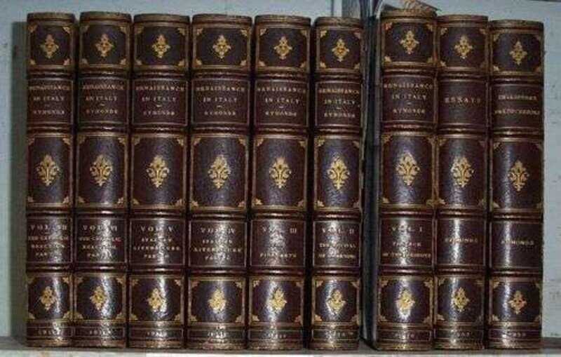 Symonds, John Addington: Renaissance in Italy. London, 1920. 7 vols. * Shakespeare's Predecessors in the English Drama. London, 1920. * Essays. London, 1907. All 8vo, uniform 3/4 maroon morocco & cloth, gilt, gilt paneled spines, t.e.g.; corners bumped, joints often rubbed., occasionally stressed.