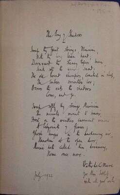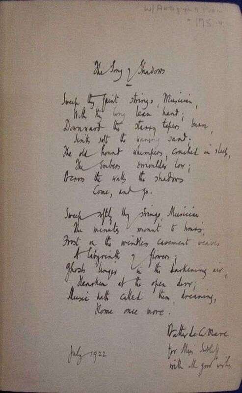 De La Mare, Walter: Poems, 1901 to 1918. London, (1922). 3rd ptg. Vol. 1 (of 2) only. 8vo, orig. blue cloth, gilt; light to moderate wear. Bearing De La Mare's autograph fair copy of his poem "The Song of Shadows," titled, inscribed, dated, July 1922, & signed in full by the poet on the front free endpaper recto. * Crossings: A Fairy Play. New York: Knopf, 1923. 1st ed. Illus. by Dorothy P. Lathrop. Sm. 4to, orig. cloth; moderate wear & dust soiling. Color frontis., full page & text plain illus.