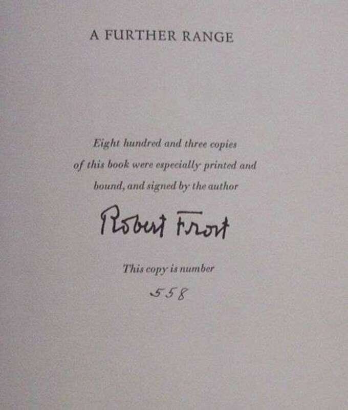 Frost, Robert. A Further Range. New York: Henry Holt, (1936). First edition, #558/803 signed by Frost. 8vo, orig. cloth, leather spine label, slipcase (some stress & wear along joints). Bright, tight copy in slightly stressed slipcase.