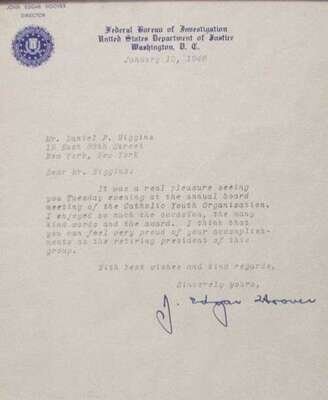Typed Letter Signed. Hoover, J. Edgar. Washingotn, D.C.: Federal Bureau of Investigation, Jan. 10, 1946. 1 p., 4to. To Daniel P. Higgins, thanking him for an award from the Catholic Youth Organization. On Hoover's FBI letterhead. Framed.