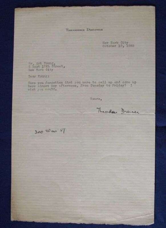 Typed Letter Signed. Dreiser, Theodore. New York, Oct. 10, 1928. 1 p., 4to. To the American cartoonist Art Young. Short letter encouraging Young to respond to an open invitation to visit. On Dreiser's letterhead.