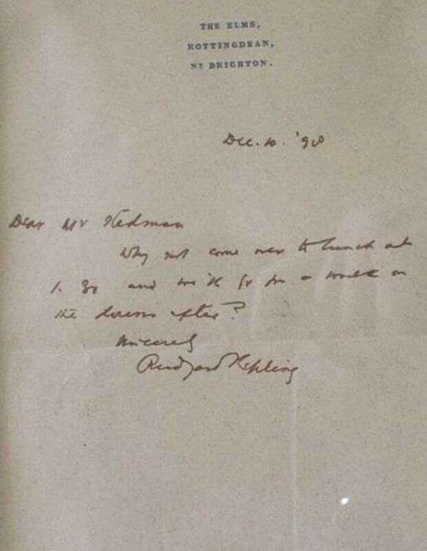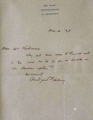 Autograph Letter Signed. Kipling, Rudyard. The Elms, Rottingdean, Dec. 10, [19]09. 1 p., 16mo, framed. Extending a lunch invitation. Framed.