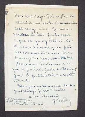 Autograph Letter Signed. Sand, G(eorge). Palanian[?], May 22, n.d. 1 p., 4to. Scattered wear, tape repair to verso. To an unidentified male correspondent, helping him ("Mon cher vieux") get a manuscript published, she will do what she can "pour la publication de votre travail..."