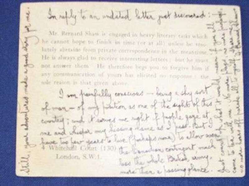 Autograph Postcard Signed. Shaw, G(eorge) Bernard. London, 1940. Good-naturedly complaining about the demands of the general public, "I am painfully conscious - being a shy sort of man - of my position as one of the sights of this country;..."