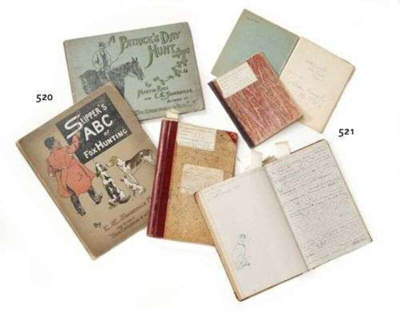 (Somerville & Ross.): Somerville, E(dith) Oe(none). Slipper's ABC of Fox Hunting. London, etc.: Longmans, Green and Co., 1903. Folio, orig. pictorial cloth; moderate wear & dust soiling, spine & ends somewhat darkened, spine ends frayed, corners bumped. 20 color plates. Occasional internal smudging. * Ross, Martin; Somerville E(dith) Oe(none). A Patrick's Day Hunt. (London): Archibald Constable, n.d. [ 1902]. Oblong folio, orig. pictorial cloth; moderate wear & soiling, edge wear, spine & corners frayed, casing slightly loose. 8 color plates, other illustratons. Both titles illustrated by Somerville.
