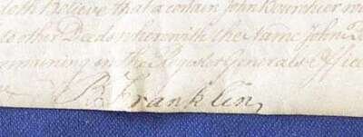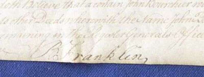 Document Signed. Franklin, B(enjamin); Carpenter, Joshua. Philadelphia, June 14 (?), 1706 & May 25, 1763. 1 p., folio on vellum. Real estate indenture with manuscript notary addenda signed by Franklin as Justice of the Peace on May 25, 1763. Paper seals. Addenda & Franklin's signature somewhat faded.