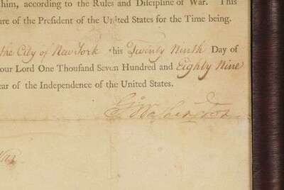 Party printed Presidental appointment filled in in manuscript & signed by Washington during the first year of the first American Presidental term. With paper seal. Showing stress & occasional minor paper loss along folds. Professionally repaired in 1951 & silked in 1961. Washington's signature slightly faded. Framed.