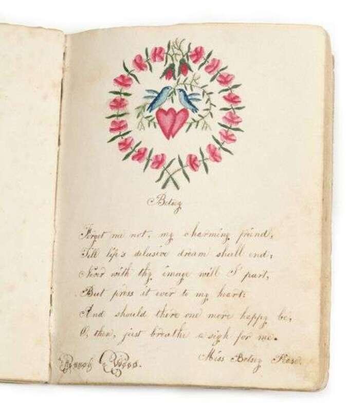 American 19th-Century Manuscript Sentiment Book. Addressing Betsey C. Pease of Springfield, [Mass.] in 1830. 16mo, orig. marbled wrappers; moderate wear & creasing. Approx. 25 pp. of manuscript verse, embellished with 18 floral watercolor drawings.