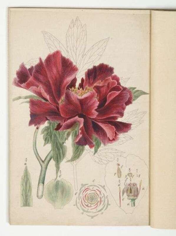 (Botanical Watercolor Book.) 19th-century Japanese Watercolor Sketchbook. 4to, orig. stiff wrappers, contemp. blue silk protective sleeve, ivory clasps. 38 skillfully executed watercolor natural history studies (37 botanical subjects) Japanese seal at lower left of first study.