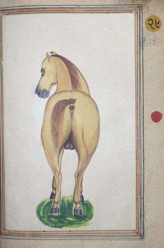 Indian Illustrated Veterinary Manuscript. "Saluria." [Diagnosis of Equine Ailments], ca. 1900. 4to, contemp. cloth. Hindi & Urdu script. Ca. 90 full-page watercolor drawings of horses.