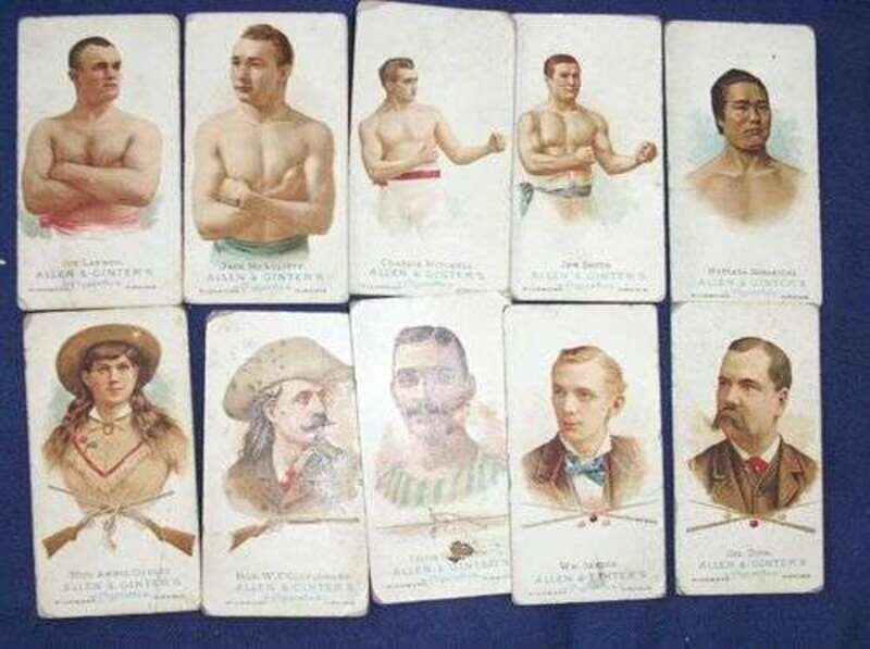 Cigarette Cards - Sportsmen & Women - Allen & Ginter's World's Champions Series: 5 Pugilists, Joe Lanno (VG-); Jack McAuliffe (VG-); Charlie Mitchell (VG/VG-); Jem Smith (VG-); Ike Weir (VG-). * 5 Wrestlers (G-/VG). * 4 Rifleshooters - complete set including Annie Oakley & Buffalo Bill (G/VG). * 6 Oarsmen (G+/VG). * 4 Billiard Players (G-/VG-).