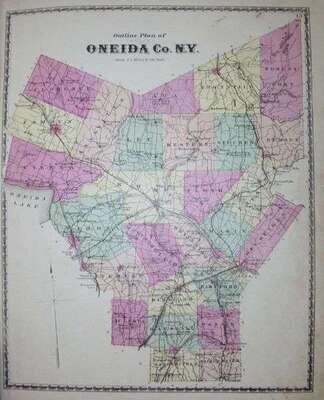 Beers, D.G. & Co., pub. Atlas of Oneida County, New York. Philadelphia, 1874. Folio, orig. cloth; worn & blistered. 50 color maps. Lacking front free endpaper. Some dampstaining to front & back matter, other moderate internal dampwrinkling & occasional soiling. Complete.