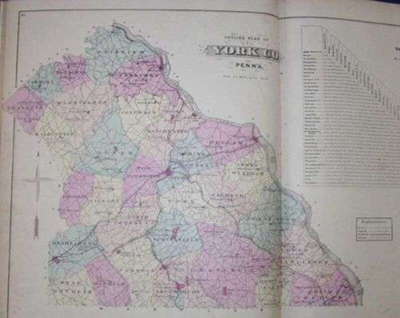 (Pennsylvania County Atlases): Beers, Frederick W. Atlas of Cumberland Co., Pennsylvania. New York: F.W. Beers & Co., 1872. Folio, orig. cloth, rebacked in modern morocco & with modern morocco corners; somewhat worn & dust soiled, new endpapers. 33 color maps (incl. fold. maps). Lithographic views. Minor internal dust soiling, but internally generally clean. Complete. Le Gear 3024. * Beach, Nicholas. Atlas of York County, Pennsylvania. Philadelphia: Pomeroy, Whitman & Co., 1876. folio, orig. cloth, rebacked in modern morocco with modern morocco corners; somewhat worn & dust soiled. New endpapers. 41 color maps. Double-page & full page lithographic views. Internally generally clean. Complete. Le Gear 3063.