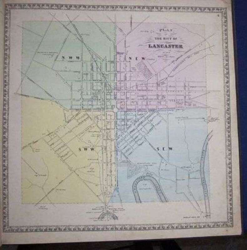 (Pennsylvania County Atlas.) Bridgens, H.F. Bridgens' Atlas of Lancaster Co., Penna. Lancaster: D.S. Bare, 1864. Folio, modern cloth. 40 color maps. Title & index pages somewhat browned & foxed, occasional light foxing to maps. Top corners of pp. 1-19 chipped - not affecting text or maps. Complete.