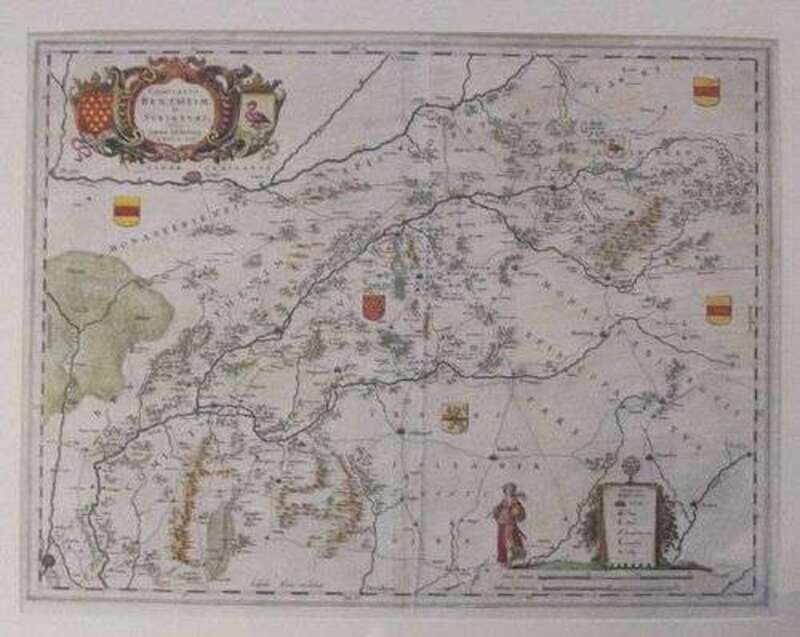 Hand-Colored Engraved Map. Bleau, Willem [& Jan]. "Comitatus Bentheim et Steinfurt." [Amsterdam], [ca. 1650]. 14 1/2 x 19 1/2 inches; 368 x 495 mm, margins. Generally clean. Old color. Framed.