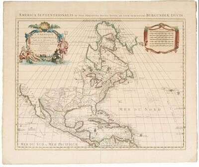 Hand-Colored Engraved Map. Delisle, Guillaume. "L'Amerique Septentrionalis." Amsterdam: Covens and Mortier, [1730]. 18 7/8 x 22 7/8 inches; 480 x 580 mm, full margins. Old outline color, cartouches hand-colored. Generally clean.