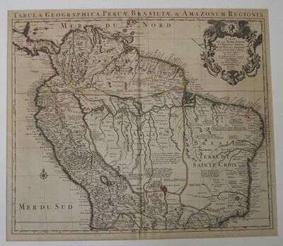 Hand Colored Engraved Map. Delisle, Guillaume. "Carte de la Terre Ferme du Perou, du Brasil, et du Pays des Amazones." Amsterdam: Covens and Mortier, [1730]. 19 5/8 x 22 5/8 inches; 498 x 575 mm. Full margins. Outline color. Generally clean. Darkening to verso.