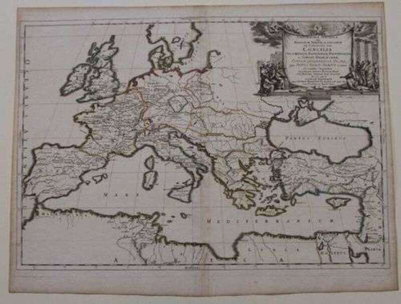 Hand-Colored Engraved Maps & C: Sanson d'Abbeville, Nicolas (Guillaume - son). "Geographia Synodica..." Paris: Pierre Mariette, 1667. Hand-colored engraved map, 16 1/8 x 22 1/2 inches; 410 x 570 mm, margins. Light age toning. Orig. outline color. Matted. Showing the Synods of the early Christian Church. * Sanson d'Abbeville, Nicolas. "Tables de la Geographia Ancienne et Nouvelle." Paris: Pierre Mariette, 1667. Engraved vignette title-page only. Folio sheet. Framed.