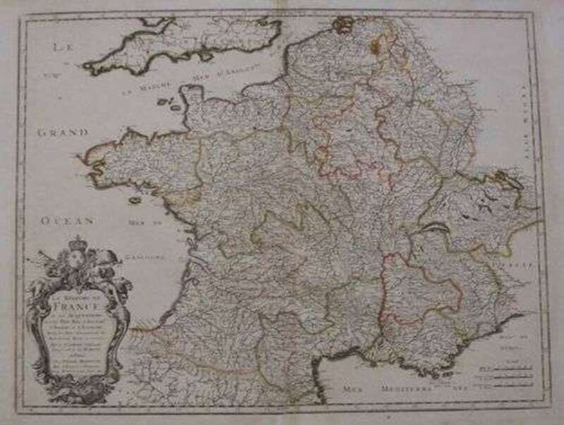 Hand-Colored Engraved Map. Sanson d'Abbeville, Nicolas. "La Royaume de France." Paris: Pierre Mariette, 1665. 16 1/4 x 21 1/4; 413 x 540 mm, full (?) margins. Slightly worn & faded. Orig. outline color. Matted.