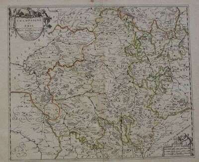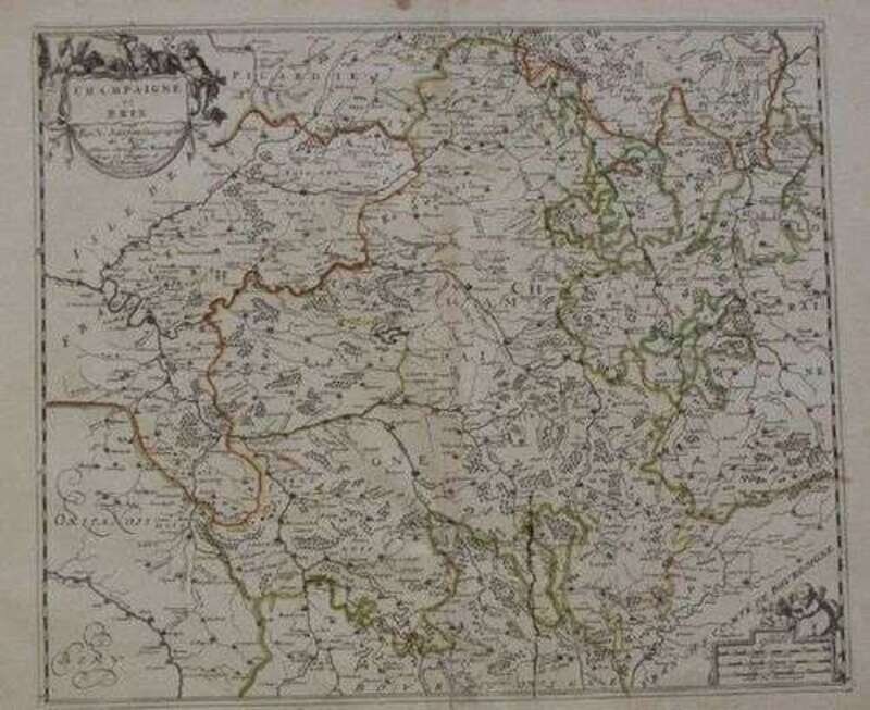 Hand-Colored Engraved Map. Sanson d'Abbeville, Nicolas. "Champaigne et Brie." Paris: Pierre Mariette, [ca. 1667]. 15 x 17 1/2 inches; 381 x 445 mm, full margins. Slightly wrinkled & age-toned, minor ink tracing. Orig. outline color. Matted.