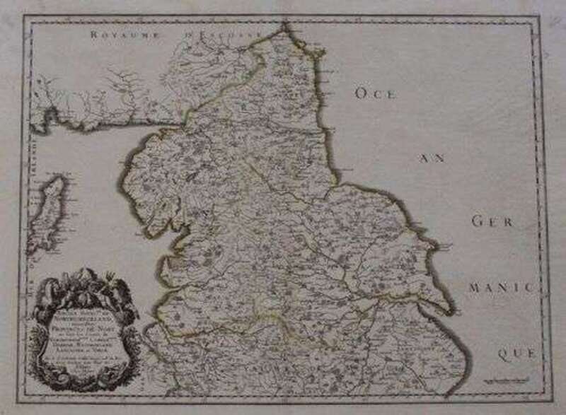 Hand-Colored Engraved Maps. Sanson d'Abbeville, Nicolas: "Ancien Royaume de Northumberland..." [English kingdom of Northumberland - Anglo-Saxon Period]. Paris, 1658. 15 1/8 x 20 inches; 384 x 508 mm, full margins. Generally clean. Orig. outline color. Matted. * "Anciens Royaumes de Mercie, et East Angles." [The Saxon Kingdom of Mercia & the Angle Kingdom of East Anglia]. Paris, 1654. 14 3/8 x 22 7/8 inches; 365 x 580 mm, full (?) margins. Generally clean. Very minor, mostly marginal dampstaining. Orig. outline color. Matted.