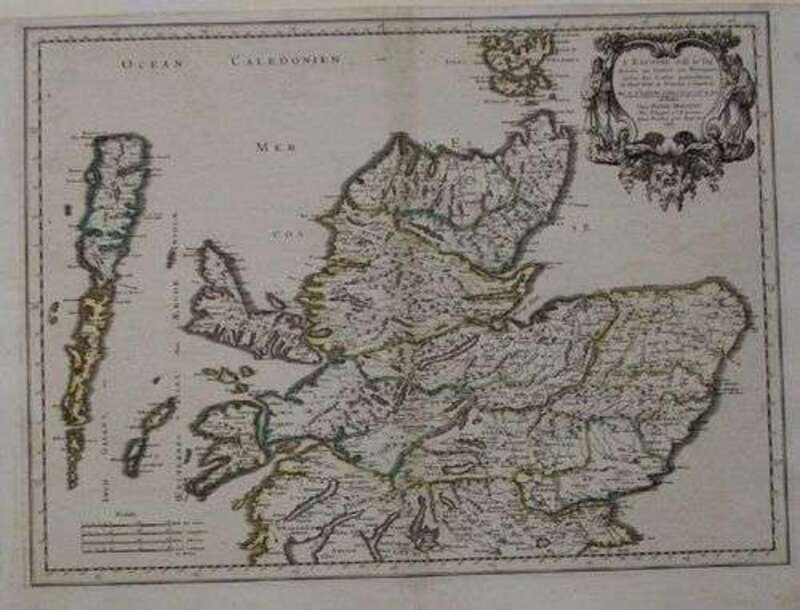 Hand-Colored Engraved Map. Sanson d'Abbeville, Nicolas. "L'Escosse dela le Tey..." [Northern Scotland - The Highlands]. Paris: Pierre Mariette, 1665. 16 x 21 3/4 inches; 406 x 552 mm, full (?) margins. Generally clean. Orig. outline color. Matted.