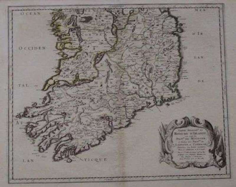 Hand-Colored Engraved Map. Sanson d'Abbeville, Nicolas. "Partie Meridiole du Royaume d'Irland..." [Southern half of Ireland]. Paris: Pierre Mariette, 1665. 15 3/8 x 19 1/2 inches; 390 x 495, full margins. Generally clean, orig. outline color. Matted.