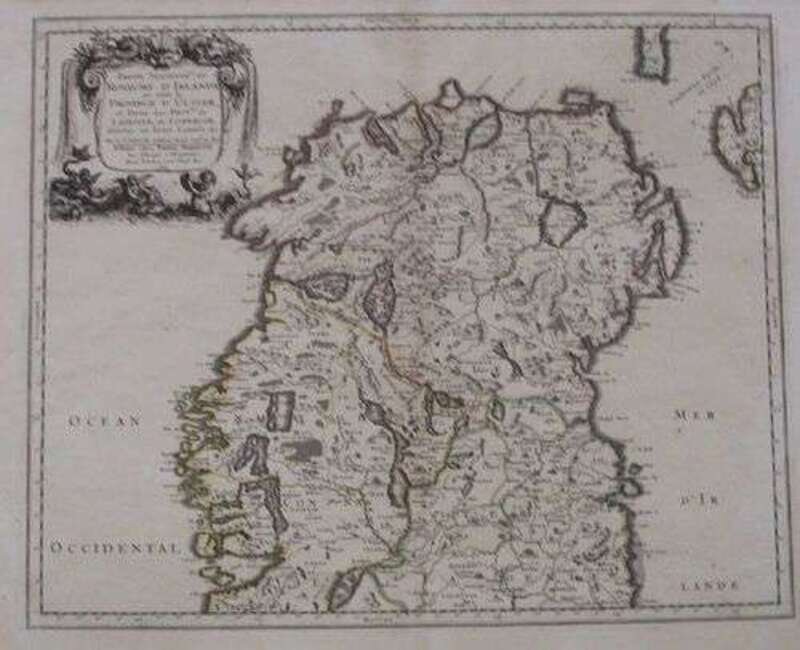 Hand-Colored Engraved Map. Sanson d'Abbeville, Nicolas. "Partie Septentrle du Royaume du Irland" [Northern half of Ireland]. Paris: Pierre Mariette, 1665. 15 5/8 x 19 5/8 inches; 396 x 498 mm, full (?) margins. Minor creasing, generally clean. Orig. outline color. Matted.