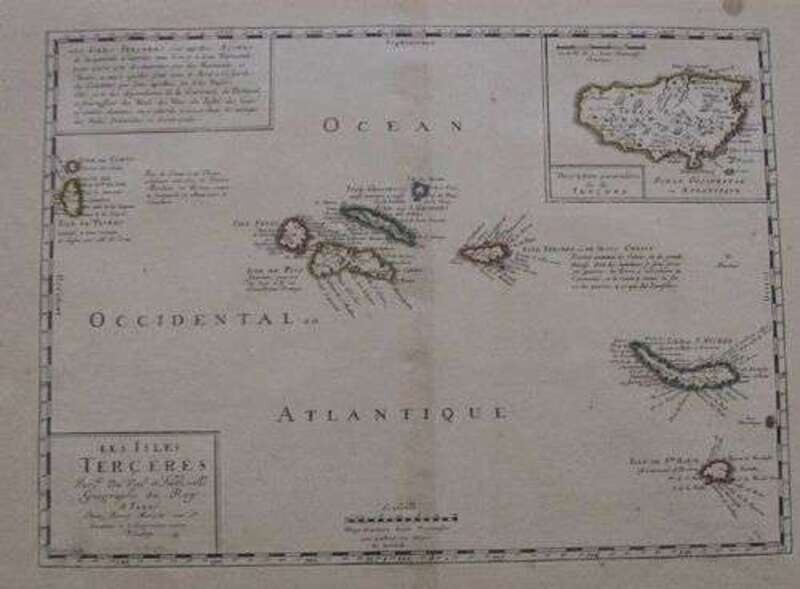 Hand-Colored Engraved Map. Sanson d'Abbeville, Nicolas. "Les Isles Terceres" [The Azores]. Paris: Pierre Mariette, [ca. 1650-1667]. 12 3/4 x 17 1/2 inches; 324 x 445 mm, full margins. Light age toning, occasional foxing, spotting & darkening to margins. Orig. outline color. Matted.