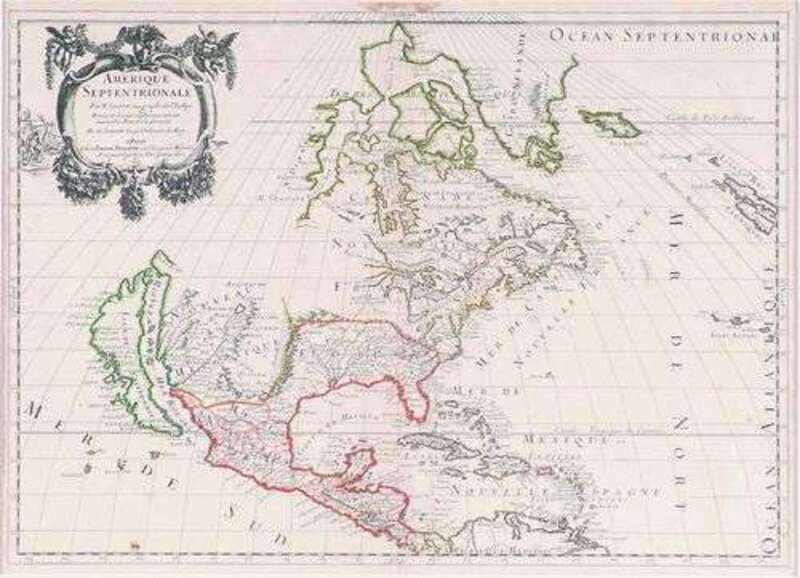 Hand-Colored Engraved Map. Sanson d'Abbeville, Nicolas. "Amerique Septentrionale." Paris: Pierre Mariette, 1669. 15 5/8 x 22 inches; 395 x 560 mm, margins. Small area of dampstaining in top center margin, small area of foxing on lower left, but generally bright & clean with contemp. color. Framed.