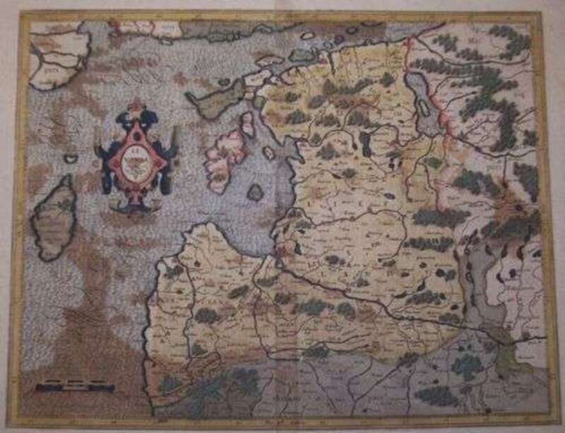 Hand-Colored Engraved Map. Mercator, Gerard. "Livonia." [Duisburg], [1602]. 14 1/4 x 18 1/2 inches; 368 x 470 mm, full (?) margins. Some age toning & minor offsetting, margins darkened at edges. Orig. color. Latin text on verso. Matted.