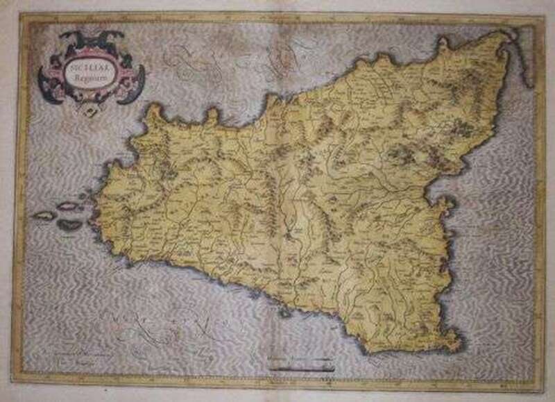 Hand-Colored Engraved Map. Mercator, Gerard. "Siciliae Regnum." [Duisburg], [1602]. 13 3/8 x 19 inches; 340 x 482 mm, full (?) margins. Light age toning, some offsetting. Orig. color. Latin text on verso. Matted.