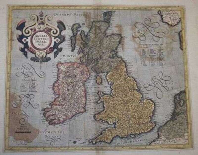 Hand-Colored Engraved Map. Mercator, Gerard. [Great Britain]. "Anglia, Scotia et Hibernia." [Duisburg], [1602]. 13 1/8 x 16 3/8 inches; 333 x 416 mm, full (?) margins. Light age toning, some offsetting, darkening to margin edges. Orig. color. Latin text on verso. Matted.