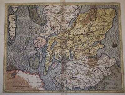 Hand-Colored Engraved Map. Mercator, Gerard. [Scotland - except for the most Northern parts]. [Duisburg], [1602]. 13 /34 x 17 7/8 inches; 350 x 454 mm, full margins. Light to moderate age toning, some offsetting, minor creasing. Orig. color. Latin text on verso. Matted.