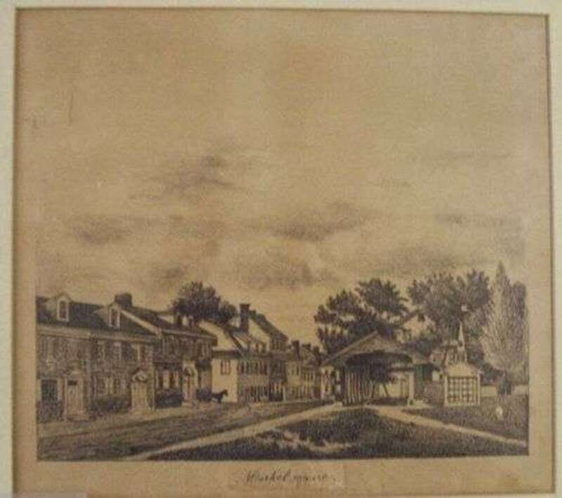 Lithograph. (Richards, John.) "Market Square." [Germantown, Pennsylvania], [ca. 1880]. Approx. 8 x 9 inches; 203 x 228 mm. With manuscript title label below image, attributed to Richard's hand. Old frame.