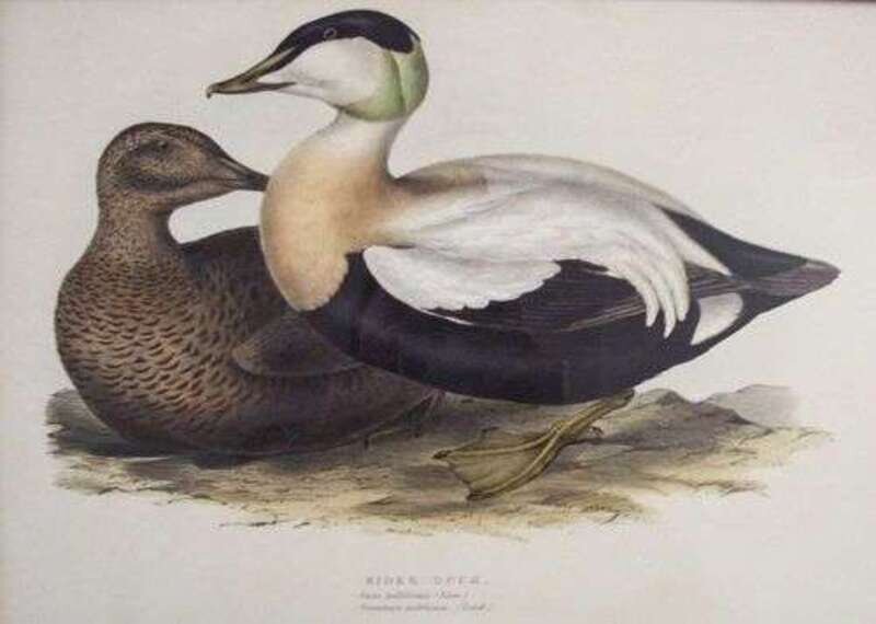 Hand-Colored Lithographs. Gould, John & [Mrs.] E. [Ducks]: "Elder Duck." * "Harlequin Duck." * "Eider Duck." Ca. 1850. Approx. 13 x 19 inches; 330 x 495 mm. Scattered light foxing, but generally clean. Framed.