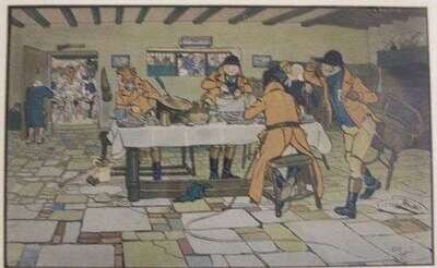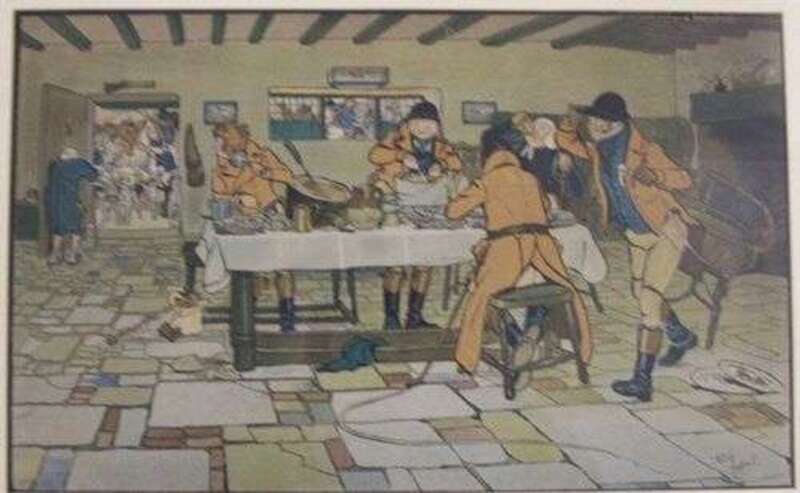 Color Print. Aldin, Cecil. "The Fallowfield Hunt: The Breakfast at the Three Pigeons." 1900. Approx. 14 3/4 x 24 1/4 inches; 375 x 615 mm - image size. Period frame.